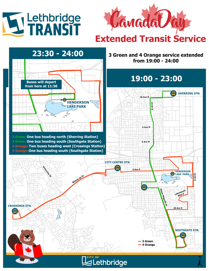 Ridership on Canada Day is free on all routes from 8 a.m. – midnight. There is also extended service for routes 3 Green and 4 Orange, and service offered after the fireworks display.