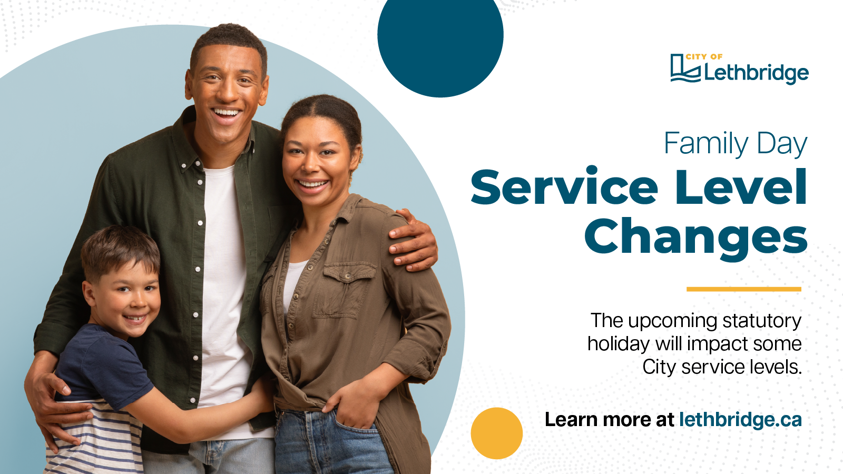 Monday, February 16, 2026, is Family Day. The City of Lethbridge will have service level changes.