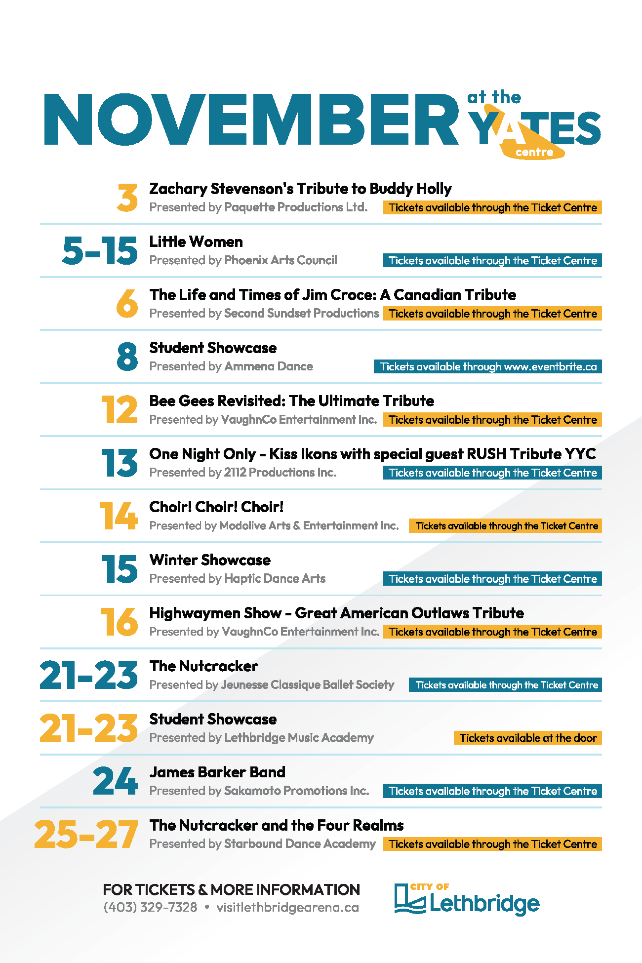 The Yates Centre, located at 1002 - 4th Avenue South, is a vibrant community theatre owned and operated by the City of Lethbridge. The facility is available for rental events and activities, and is home to Lethbridge's only professional theatre company, New West Theatre. The Yates Theatre has a capacity of 474 and the Sterndale Bennett Studio Theatre has a capacity of 162. There are hotels and motels, as well as a wide variety of restaurants, all within walking distance of the theatre. Parking is available on the street and in several adjacent lots. During the day there are various restrictions on parking, including time limits and coin meters. All parking is free after 4:00 p.m. weekdays and anytime on weekends.