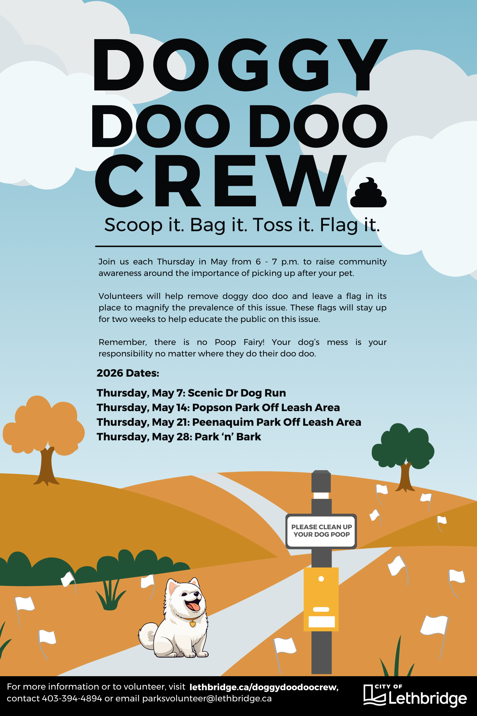In preparation for our Dog Waste Awareness Month, the City of Lethbridge will be holding four dog park cleanups.