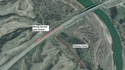 The north lane on westbound Whoop-Up Drive will close daily, from Monday to Saturday, at 9 a.m. to allow resources to access the river valley.