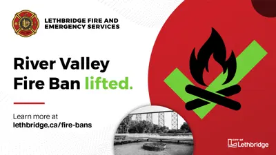 The River Valley Fire Ban in Lethbridge has been lifted, effective immediately. Recent changes in weather conditions, including higher humidity levels, have reduced the fire risk in this area.