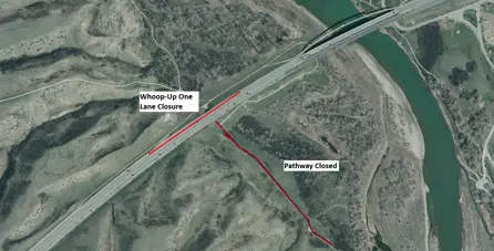 The north lane on westbound Whoop-Up Drive will close daily, from Monday to Saturday, at 9 a.m. to allow resources to access the river valley.