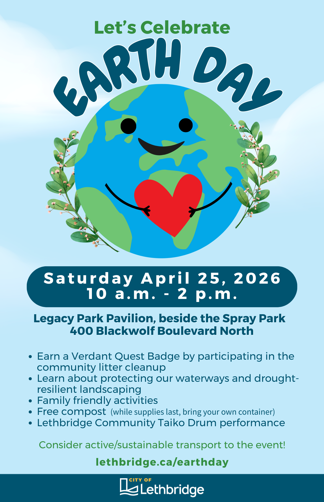 Earth Day is on the horizon! The City of Lethbridge is gearing up to celebrate and advocate for the environment. Please join us for a day of education and action Saturday, April 25 at Legacy Park with a range of activities planned for all ages.