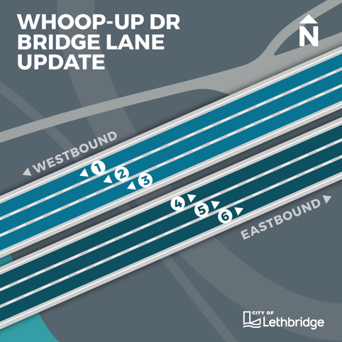 Starting at 9 a.m. Thursday, November 20, the south lane of westbound Whoop-Up Drive will start taking traffic while continuing repairs will temporarily close the middle westbound lane.