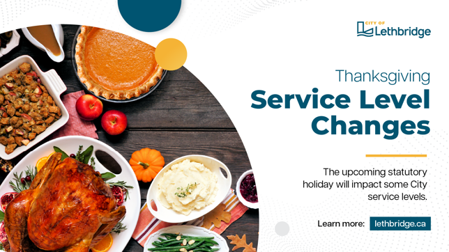 Monday, October 13, is Thanksgiving. The City of Lethbridge will have service level changes.
