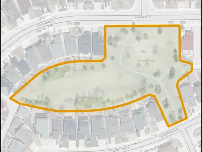 This neighbourhood park features a small playground ideal for younger children and a nice seating area for parents. There are plenty of diverse trees and shrubs that make for great hiding spots for a game of hide and seek.