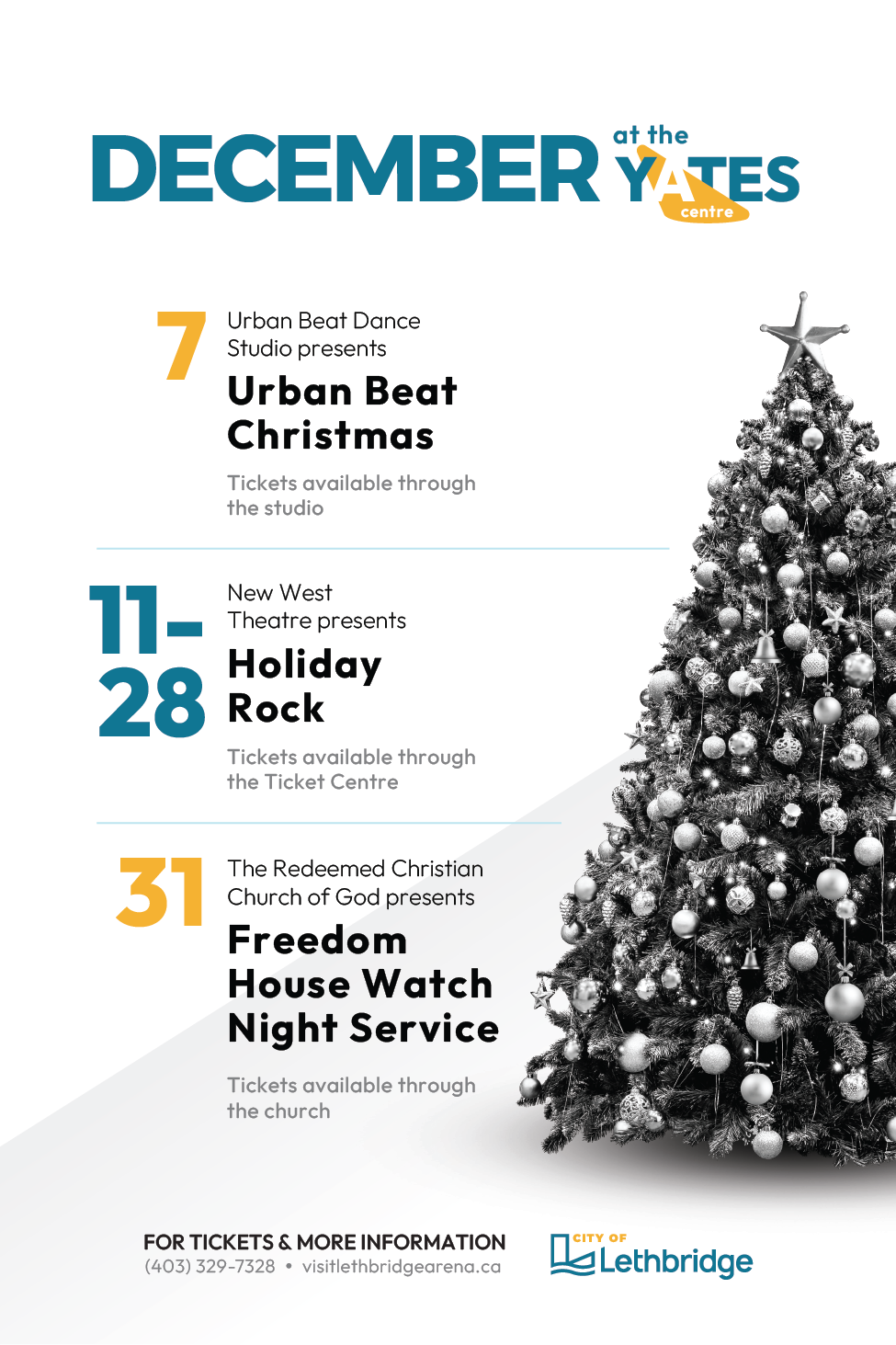 The Yates Centre, located at 1002 - 4th Avenue South, is a vibrant community theatre owned and operated by the City of Lethbridge. The facility is available for rental events and activities, and is home to Lethbridge's only professional theatre company, New West Theatre. The Yates Theatre has a capacity of 474 and the Sterndale Bennett Studio Theatre has a capacity of 162. There are hotels and motels, as well as a wide variety of restaurants, all within walking distance of the theatre. Parking is available on the street and in several adjacent lots. During the day there are various restrictions on parking, including time limits and coin meters. All parking is free after 4:00 p.m. weekdays and anytime on weekends.